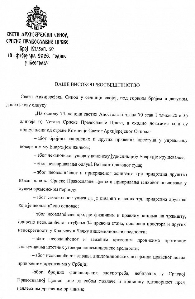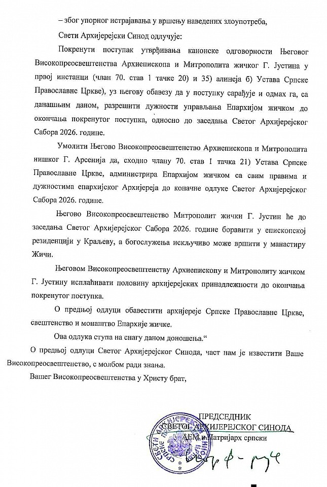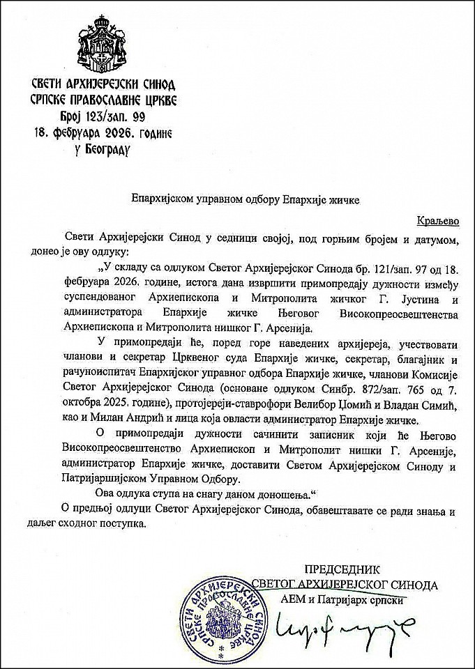 Свети Архијерејски Синод Српске Православне Цркве је на својој седници 18. фебруара текуће године, на основу 74 канона светих Апостола и члана 70 став 1 тачки 20 и 35 алинеја б) Устава Српске Православне Цркве, донео одлуку којом је Његово Високопреосвештенство Архиепископa и Митрополитa жичког Г. Јустина разрешио дужности управљања повереном му Епархијом жичком до редовног заседања Светог Архијерејског Сабора 2026. године, и покренуо поступак за утврђивање његове канонске одговорности. Истовремено, Свети Архијерејски Синод је за администратора Епархије жичке, до предстојећег заседања Светог Архијерејског Сабора, именовао Његово Високопреосвештенство Архиепископа и Митрополита нишког Г. Арсенија.